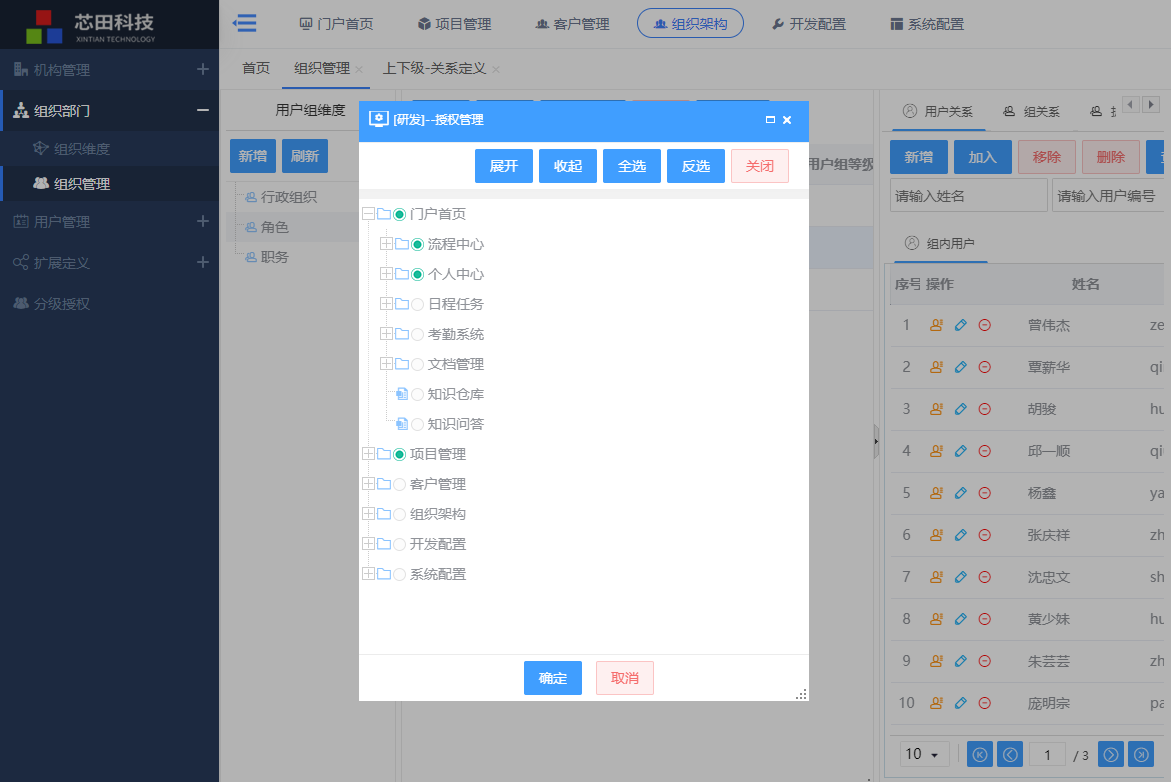 平台提供全面的功能权限管理,包括访问页面、数据、按钮权限