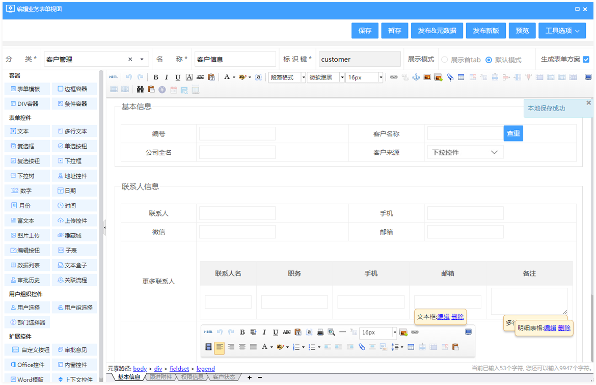 - 文本框、数字框、日期框、文本域、下拉框、富文本框、上传附件、地图等